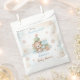 Cute Favour Bag for boy Christmas baby shower with an adorable baby bear, Christmas tree and presents in blue, beige and green with faux glitter golden snowflakes and stars.