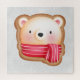 A puzzle with a cute and adorable bear face set on a cookie base. Wearing a red and white striped scarf.