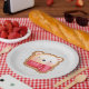 Paper plates with a cute and adorable bear face set on a cookie base. Wearing a red and white striped scarf.