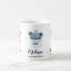 A mug with a cute illustration of a blue bear wearing a nurses hat with a little heart on it. Also wearing a protective face mask and has a blue stethescope too.