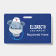 Name badge with a cute illustration of a blue bear wearing a nurses hat with a little heart on it. Also wearing a protective face mask and has a blue stethescope too.