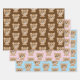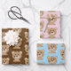 A set of 3 wrapping paper sheets (one brown , one pink one blue) for a baby shower with the pattern of the face of a bear with a heart on hiss cheek .