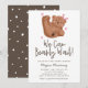 Cute bear theme baby shower featuring hand painted illustration of a cub with a pink bow and hearts. The text says "we can bearly wait!" This invitation is great for a girl's baby shower.