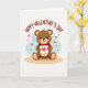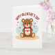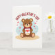 This greeting card features a cocoa-brown teddy bear in the center, looking straight ahead with wide black eyes, rosy cheeks, and a happy open smile. A deep red scarf wraps around its neck, adding a strong pop of color against the bear’s soft brown fur. The bear is holding a small white card with a bright red heart on the front, like it’s offering it to someone special 💘. Behind the bear, there’s a light blue cloud-like shape that frames its head, and the background stays white and simple. Small red hearts float around the bear, adding a sweet, loving feel without looking busy ❤️. Across the top, the text reads “HAPPY VALENTINE’S DAY” in curved, dark red cursive-style lettering above the bear’s head. The bear stands on a sandy beige oval that suggests a little patch of ground and helps anchor the scene.