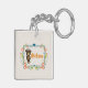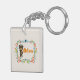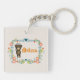 A personalised keychain designed with a cute illustration of a cartoon brown bear saying hello and holding a yellow daisy. Surrounded by a decorative floral wreath with flowers, leaves, sprigs and hearts. Autumn colour scheme.
