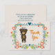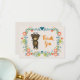 A thank you card designed with a cute illustration of a cartoon brown bear holding a yellow daisy. Hello written above his head. Surrounded by a decorative floral wreath with flowers, sprigs and hearts. Autumn colour scheme. Personalised message on the back.