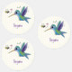 This cute design features a green and purple happy hummingbird with a bee friend on a yellow polka dot background . All done in happy cartoon illustration style!