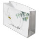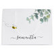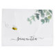 A chic white background. Decorated with watercolored eucalyptus greenery, foliage and a cute, happy smiling bee. Personalise and add a name. The name is written with a modern hand lettered style script with swashes.