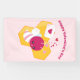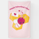 Happy Valentine's Day banner with an image of a pink and white striped bumble bee. A piece of yellow honeycomb behind. A letter sealed with a heart and a group of floating hearts are also part of the design.