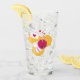 A pint glass with an image of a pink and white striped bumble bee. A piece of yellow honeycomb behind. A letter sealed with a heart and a group of floating hearts are also part of the design.