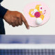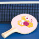Ping pong paddle with an image of a pink and white striped bumble bee. A piece of yellow honeycomb behind. A letter sealed with a heart and a group of floating hearts are also part of the design.