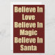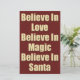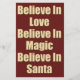 Cute Christmas saying about Santa Claus in cream and dark red text with snowflakes and a red paper background. Believe in Love, Believe in Magic, Believe in Santa.