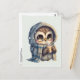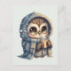 Postcard with a kawaii illustration of a big-eyed owl in a winter robe and scarf holding a hot coffee.