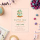 Green acrylic baby shower invitation with a little chick hatching from its egg. The colour palette is green, yellow and orange. The illustration represents a baby chick hatching and the text reads " A little chick is about to hatch". Illustrated and designed by Patricia Alvarez.