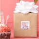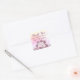 Cute pink cat with purple flowers thank you sticker for baby girl birthday celebration.