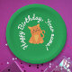 These customisable birthday paper plates feature an adorable orange kitten on a bright green background, accented with modern, white, handwritten typography. The design allows you to personalise the text with a birthday wish and a name. Perfect for kids' birthdays, animal lovers, and fans of cute cartoons, these plates add a playful and charming touch to any celebration. You can easily edit the message to suit the occasion, making them a delightful addition to birthday parties and special events. Celebrate in style with these unique, customisable plates that bring warmth and fun to the festivities.