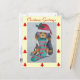This cute little black and brown mixed breed Christmas puppy is looking very festive wearing his red santa hat with a sprig of holly in it. He's holding his red and green stripy Christmas stocking in his mouth as he eagerly awaits a visit from Santa Claus to fill his stocking with lots of gifts and other doggy goodies. He looks very special on this seasonal postcard. The cute little puppy design really stands out against the neutral background and has the greeting Happy Christmas written above in green lettering I think this original postcard with the cute little water-colour puppy picture makes great Christmas send for someone special for this Christmas holiday.