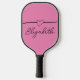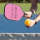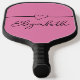A heart is above an elegant black script. You can edit the text to show the correct name or a custom message. The pickleball paddle is pink.