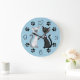 Cute Black and White Cats and Paw Prints on Blue Large Clock