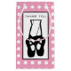Thank you gift bag with a black illustration of a ballet dancers slippers and her lower legs which are transparent allowing the colour of the background to show through. Ballerina is standing on her toes, en pointe. Background is a pattern made of white polka dots on pink.
