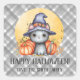 A sweet watercolor black cat in a witch hat with pumpkins, set against a grey plaid background. These personalised Halloween stickers are ideal for families who want to add a festive touch to trick-or-treat bags, party favours, and seasonal gifts. Customise with your name to make your Halloween treats extra special.
