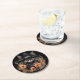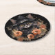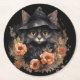 Paper coasters with a cute illustration. A black long-haired cat wearing a black witch's hat. It's ears poking out. Surrounded by orange and brown autumn flowers. Perfect for cat lovers.