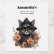 Party bottle labels with a cute illustration. A black long-haired cat wearing a black witch's hat. It's ears poking out. Surrounded by orange and brown autumn flowers. Perfect for cat lovers.