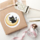 This cute black cat sticker features an adorable cartoon cat sitting peacefully on a glowing crescent moon.