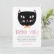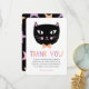 This cute thank you card features a hand drawn black cat, with pastel pink and peach accents. Modern text reads, "THANK YOU" in pastel purple, peach, and pink. Text templates are included for easy personalisation. Perfect for sending out after a cat or Halloween themed birthday party!