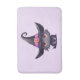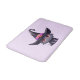 A bath mat with a fun Halloween themed illustration for cat lovers. A big-eyed black cat wearing a large black witch's hat with a purplish pink belt around the brim.