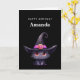 Birthday card with a fun Halloween themed illustration for cat lovers. A big-eyed black cat wearing a large black witch's hat with a purplish pink belt around the brim.