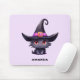 Mousepad with a fun Halloween themed illustration for cat lovers. A big-eyed black cat wearing a large black witch's hat with a purplish pink belt around the brim.