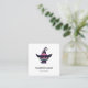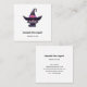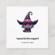 Square business card with a fun Halloween themed illustration for cat lovers. A big-eyed black cat wearing a large black witch's hat with a purplish pink belt around the brim.