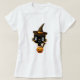 Celebrate Halloween with a cute black cat witch T-shirt. Featuring a playful black cat dressed as a witch, holding a pumpkin candy bucket filled with sweet treats.