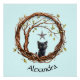 A cute black kitten sitting in a woven branch wreath watches a silver star that is hanging from a tree branch.