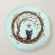 A cute black kitten sitting in a woven branch wreath watches a silver star that is hanging from a tree branch.