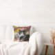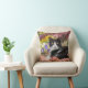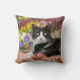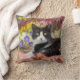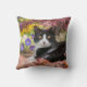 Cute cat, tuxedo pattern black and white bicolor, European Shorthair, resting under a Japanese Maple in a flowery garden and looking curiously. Photo taken by Katho Menden. This pillow is a gift idea for cat lovers.