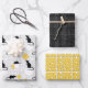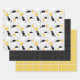 A fun and unique wrapping paper set you can use for someone who loves mice and rats! The black, white and light yellow color palette will stand out on the gift table. Little black silhouettes of mice stand on white circles searching for their swiss cheese, which is just in front of their nose. The background is white with a hand drawn grid overlay. The complimenting papers support the main design, showcasing a reverse background (white on black) on one, and slices of swiss cheese on a white background on the other.