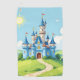 Cute blue and white castle with red flags on a bright summer day. This beautiful whimsical illustration with the sun, clouds, blue sky and green hill grass.