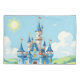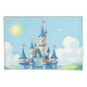 Cute blue and white castle with red flags on a bright summer day. This beautiful whimsical illustration with the sun, clouds, blue sky and green hill grass.