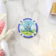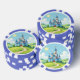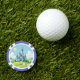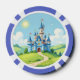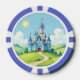 Cute blue and white castle with red flags on a bright summer day. This beautiful whimsical illustration with the sun, clouds, blue sky and green hill grass.