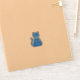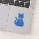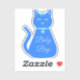 This awesome shaped sticker sheet features a digital art image of a cute blue cat with a curly tail. His eyes are pale blue with black pupils. He is wearing a pink bow in his hair and a shining blue collar round his neck with a blue token on it.