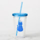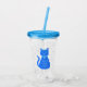 This awesome tumbler features a digital art image of a cute blue cat with a curly tail. His eyes are pale blue with black pupils. He is wearing a pink bow in his hair and a shining blue collar round his neck with a blue token on it.