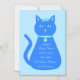 This awesome magnetic Baby Shower invitation features a digital art image of a cute blue cat with a curly tail. His eyes are pale blue with black pupils. He is wearing a pink bow in his hair and a shining blue collar round his neck with a blue token on it.