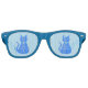 This awesome pair of party shades features a digital art image of a cute blue cat with a curly tail. His eyes are pale blue with black pupils. He is wearing a pink bow in his hair and a shining blue collar round his neck with a blue token on it.