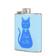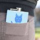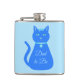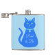 This awesome hip flask features a digital art image of a cute blue cat with a curly tail. His eyes are pale blue with black pupils. He is wearing a pink bow in his hair and a shining blue collar round his neck with a blue token on it.