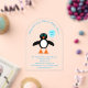 This awesome acrylic Baby Shower invitation features a cute cartoon of a blue penguin with blue eyes, a little orange beak and a white tummy. The penguin is holding a powder blue balloon. There is pale blue text inside the balloon that says, “Baby boy”. There is custom text so you can include the name of the Mother-to-Be and all the important details.