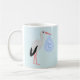 This awesome mug features a graphic image of a cute white Stork with black tail feathers holding onto a pale blue bundle of blankets. There is blue text on the bundle that says "Baby Boy". This design is perfect for celebrating a baby boy.