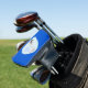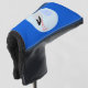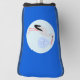 This awesome golf putter cover features a graphic image of a cute white Stork with black tail feathers holding onto a pale blue bundle of blankets. There is blue text on the bundle that says "Baby Boy". This design is perfect for celebrating a baby boy.