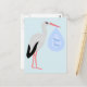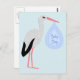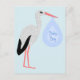 This awesome postcard features a graphic image of a cute white Stork with black tail feathers holding onto a pale blue bundle of blankets. There is blue text on the bundle that says "Baby Boy". This design is perfect for celebrating a baby boy.